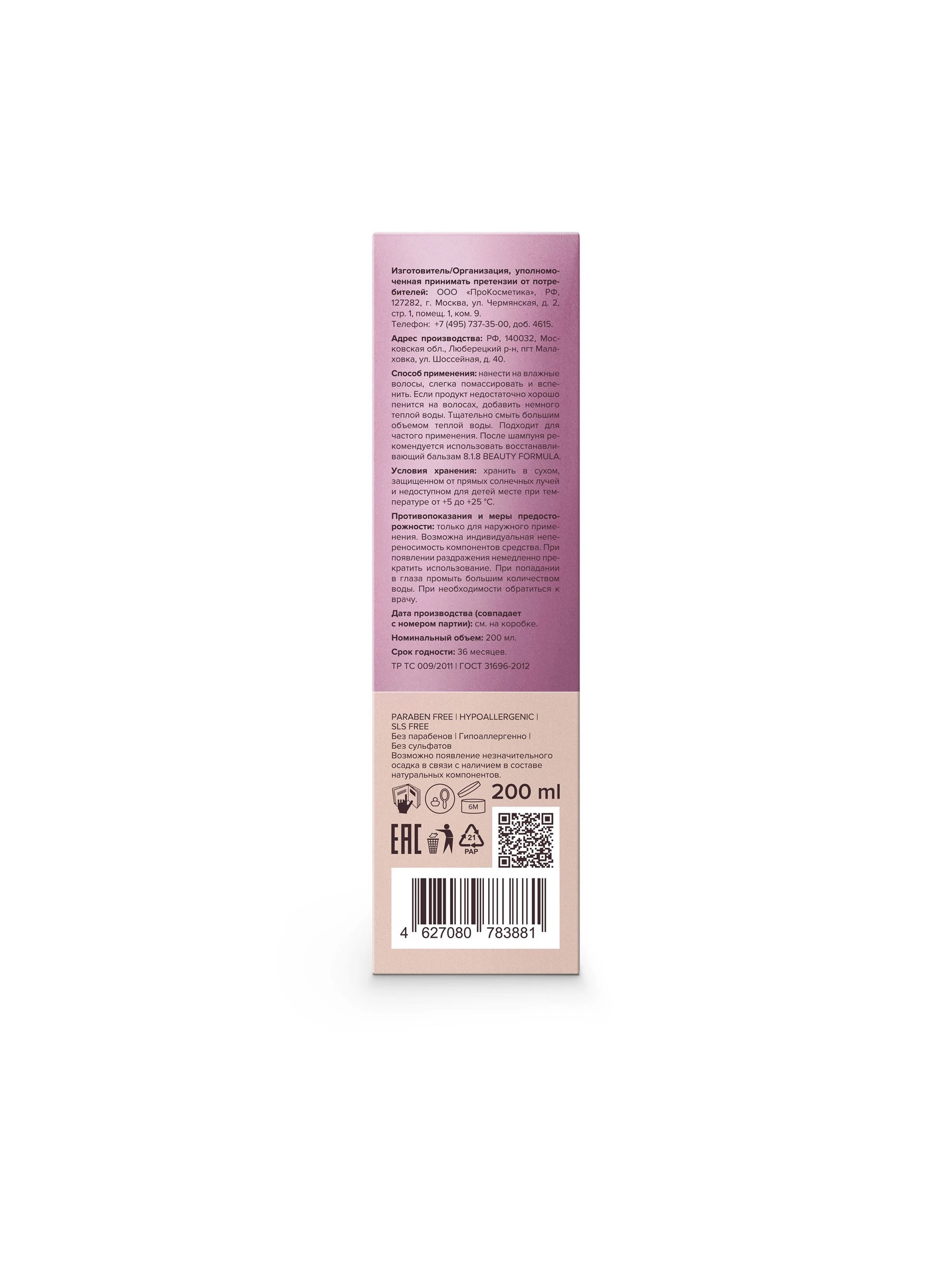 Нежный и бархатный шампунь с ароматной пеной деликатно очищает кожу.Нанести на влажные волосы, слегка помассировать, распределить по всей длине, вспенить. Если шампунь недостаточно хорошо пенится на волосах, добавить немного теплой воды. Тщательно смыть большим объемом теплой воды. Подходит для частого применения. Регулярное использование шампуня значительно улучшает состояние волос. После шампуня рекомендуется использовать восстанавливающий бальзам 8.1.8 BEAUTY FORMULA.