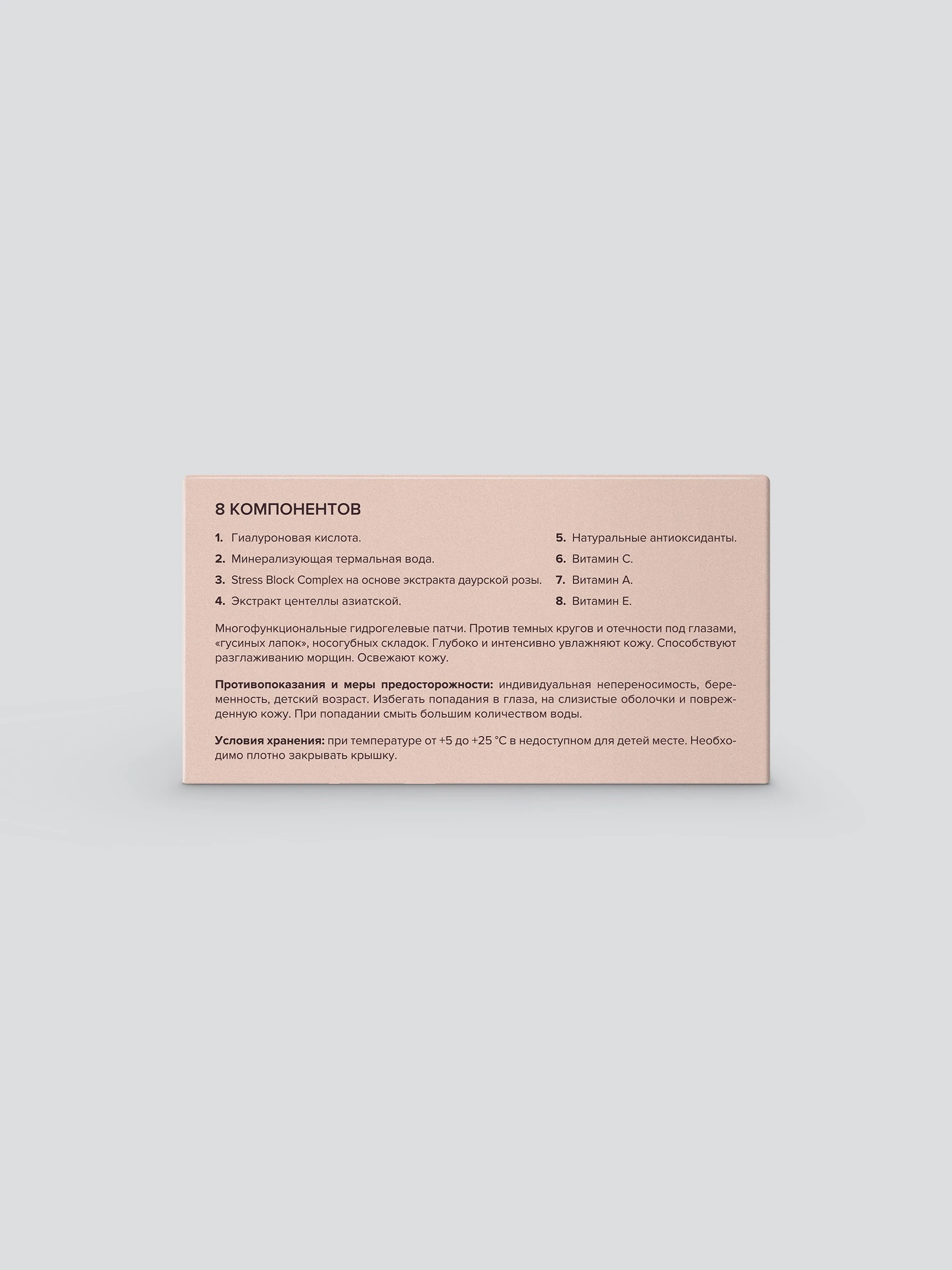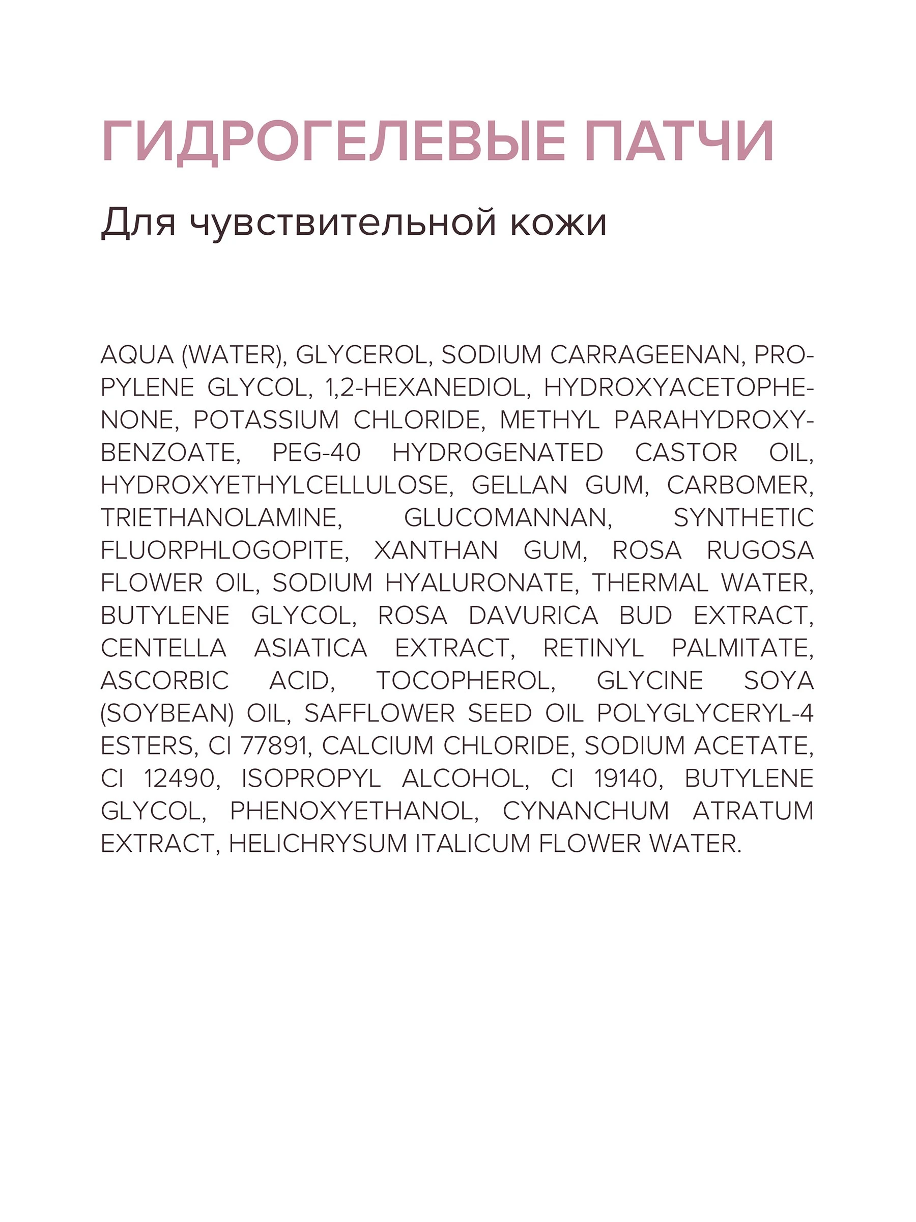 Многофункциональные гидрогелевые патчи. Подходят коже 35+ с возрастными изменениями. Против темных кругов и отечности под глазами, «гусиных лапок», носогубных складок. Глубоко и интенсивно увлажняют кожу. Способствуют разглаживанию морщин. Освежают кожу.