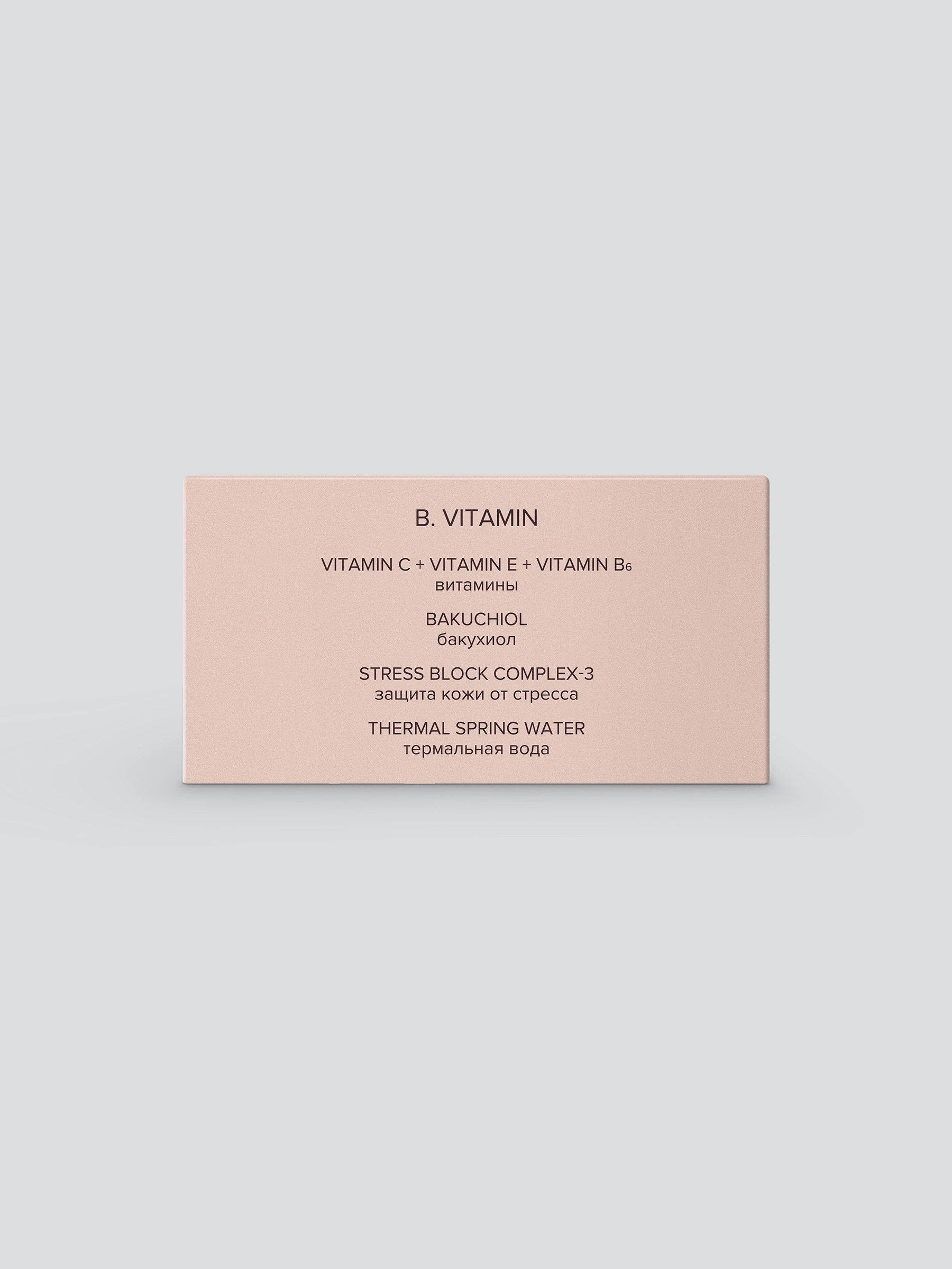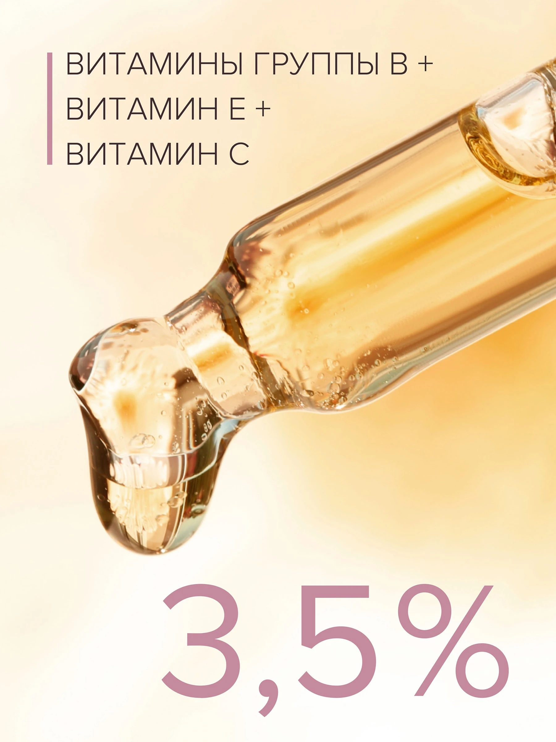 - ВИТАМИН Е + ВИТАМИН С + ВИТАМИН B6 в концентрации 3,5 % защищают от оксидативного стресса и фотостарения. Восстанавливают здоровье кожи. Стимулируют регенерацию.