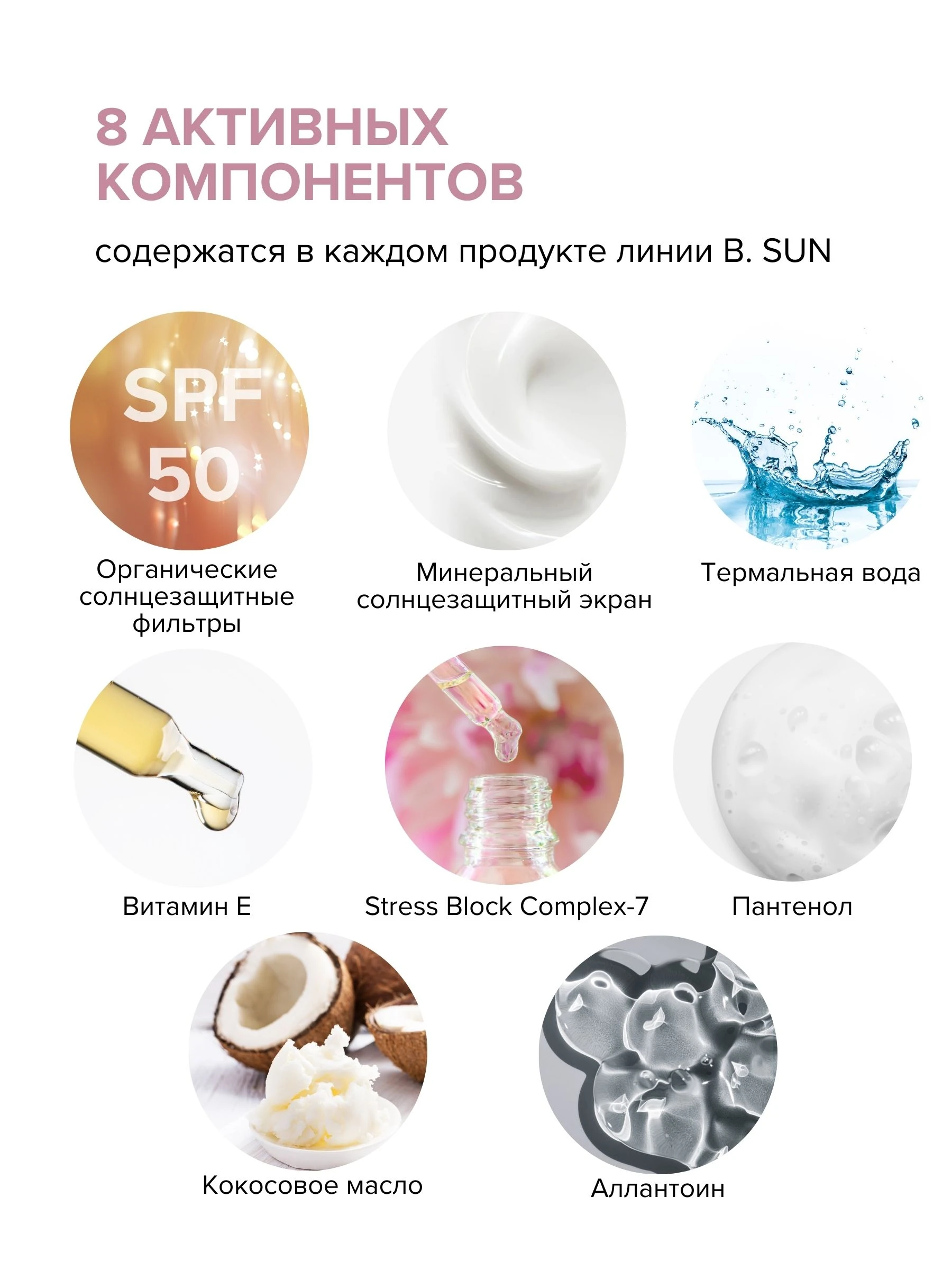 Органические солнцезащитные фильтры, минеральный солнцезащитный экран, бустер, термальная вода, экстракт центеллы азиатской, Stress Block Complex-7, масло кокоса, витамин Е, пантенол, аллантоин.